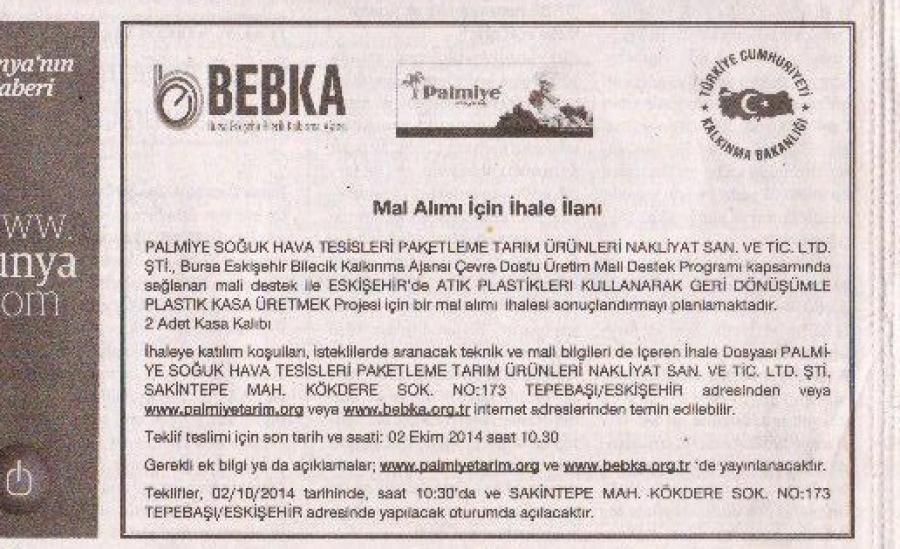 Palmiye Soğuk Hava Tesisleri Paketleme Tarım Ürünleri Nakliyat San. Ve Tic. Ltd. Şti., Bursa Eskişehir Bilecik Kalkınma Ajansı Çevre Dostu Üretim Mali Destek Programı kapsamında sağlanan mali destek ile ESKİŞEHİR'de ATIK PLASTİKLEİR KULLANARAK GERİ DÖNÜŞÜMLE PLASTİK KASA ÜRETMEK Projesi için bir mal alımı ihalesi sonuçlandırmayı planlamaktadır.